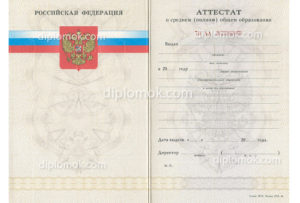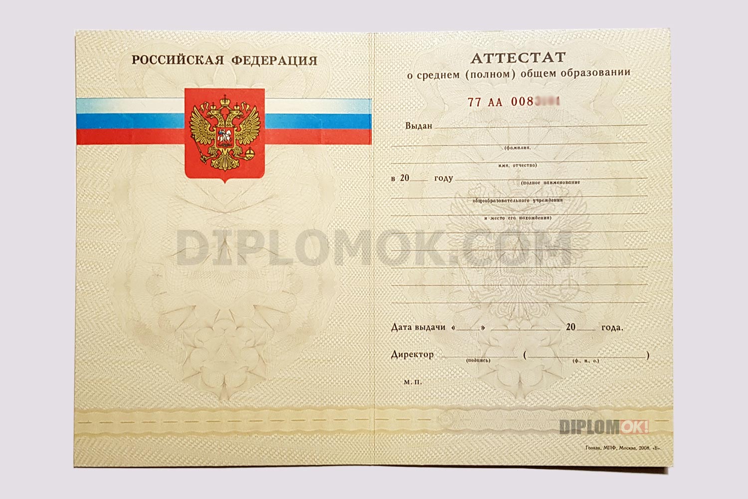 Аттестат о среднем (полном) общем образовании с окончанием 11 классов в промежуток с 2007 по 2009 года, заполненный в соответствии с государственными стандартами. Заверяется документ круглой гербовой печатью выбранной школы и подписью директора.